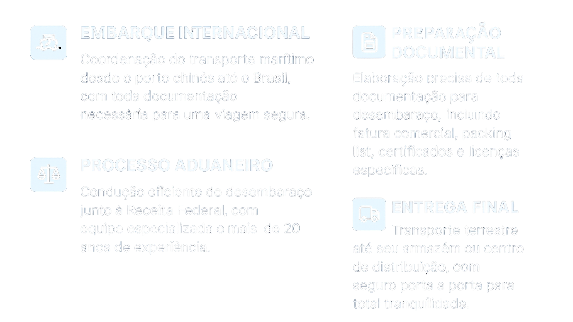 Nosso compromisso é oferecer uma jornada de importação estruturada, transparente e alinhada aos objetivos do seu negócio. Atuamos com foco total em resultados reais e mensuráveis, garantindo segurança em cada etapa do processo. Veja o que nos diferencia: